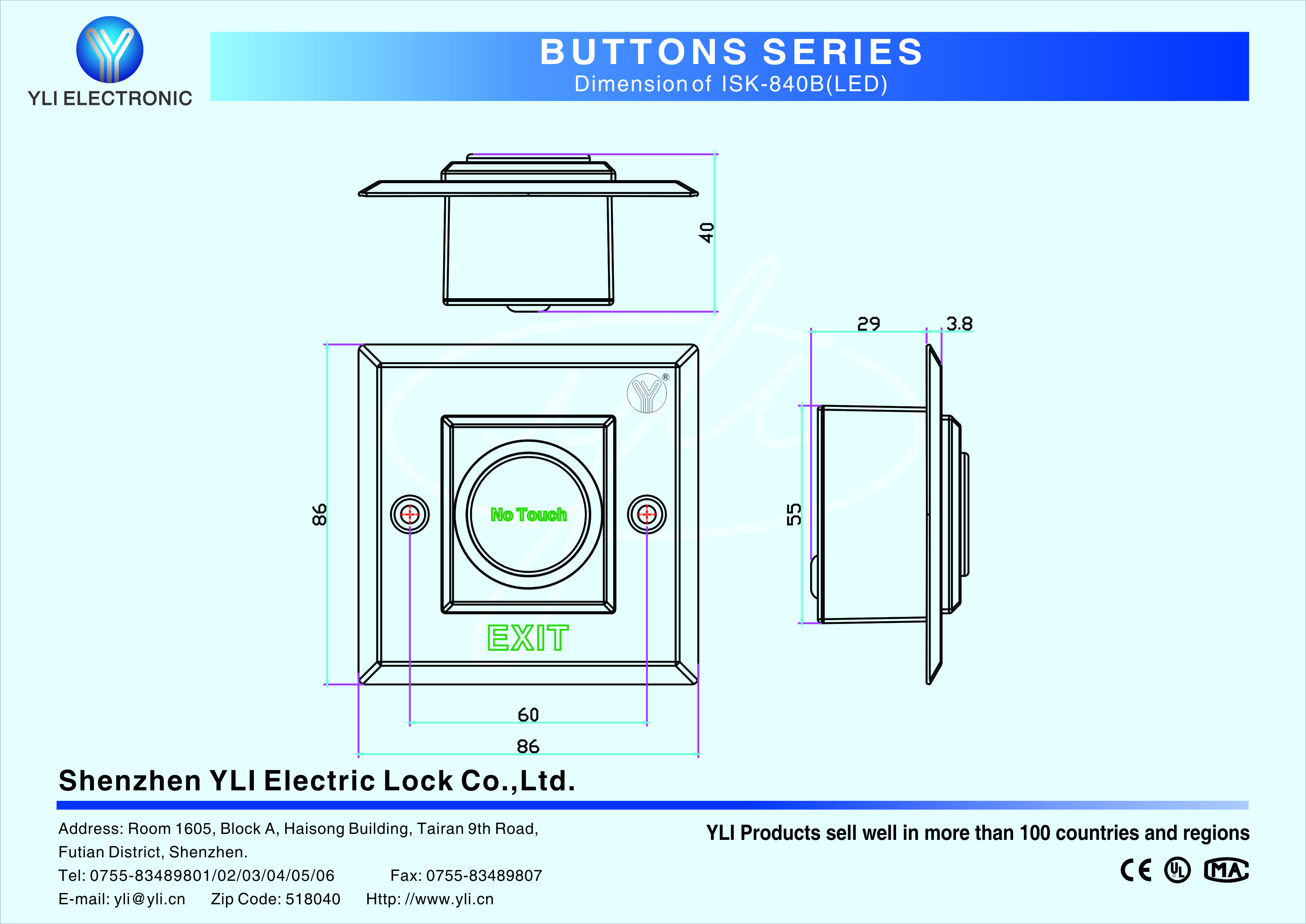 ISK-840B is an Infrared Sensor Exit Buttonin size of 86Lx86Wx29H(mm) suitable for all kinds of locks. Blue LED Lighting. Induction distance 0.1-10cm.
