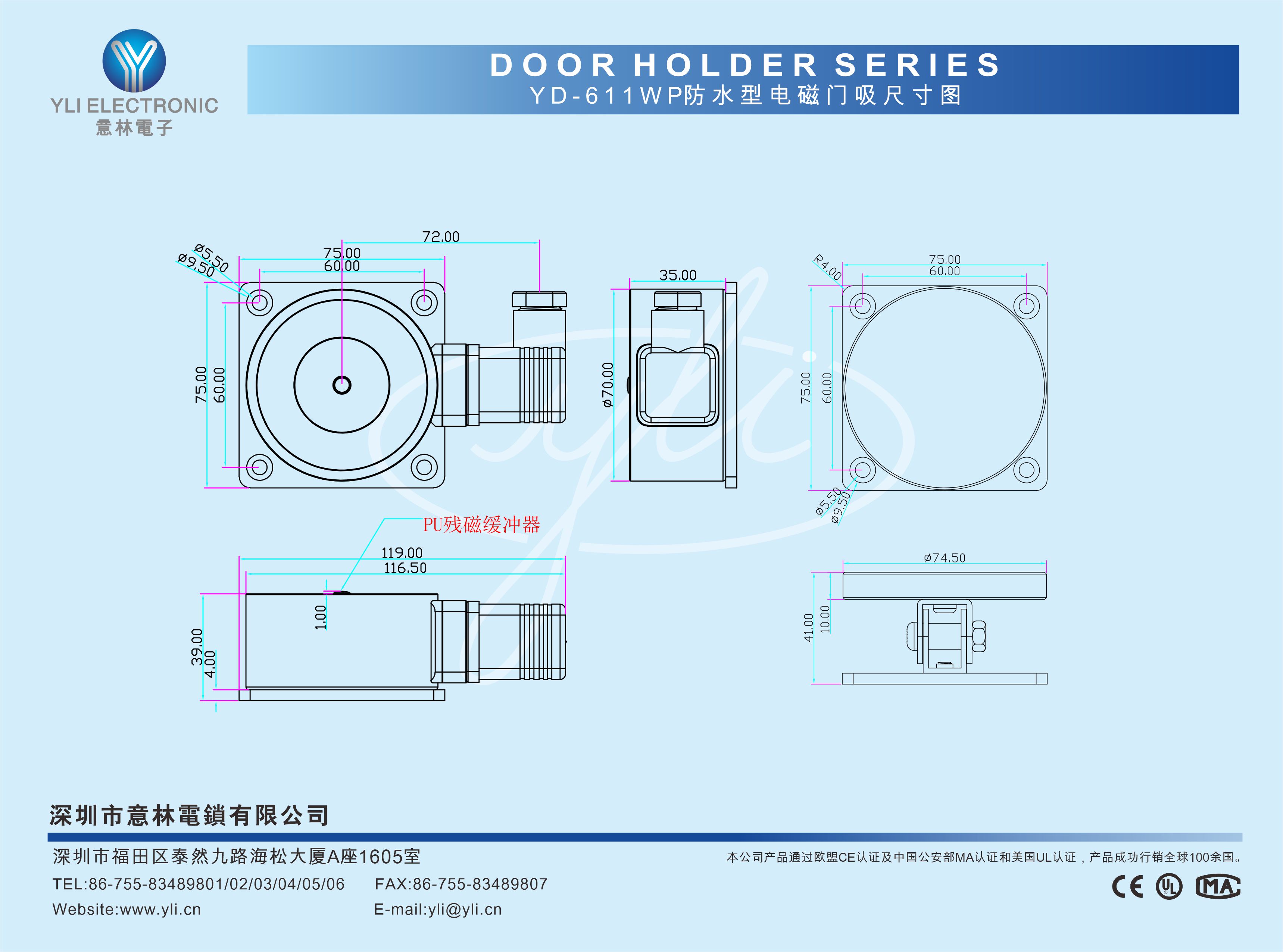 YD-611WP是墻壁式防水型電磁門吸,防水等級IP65,拉力150kg,表面處理采用國際頂級的電鍍工藝,通過國家雙C實驗室500小時鹽霧測試合格,廣泛應(yīng)用于戶外建筑設(shè)施,輪船、核電站、港口、碼頭、地鐵站等潮濕或露天場所使用。專業(yè)防殘磁設(shè)計,使得更安全耐用。
