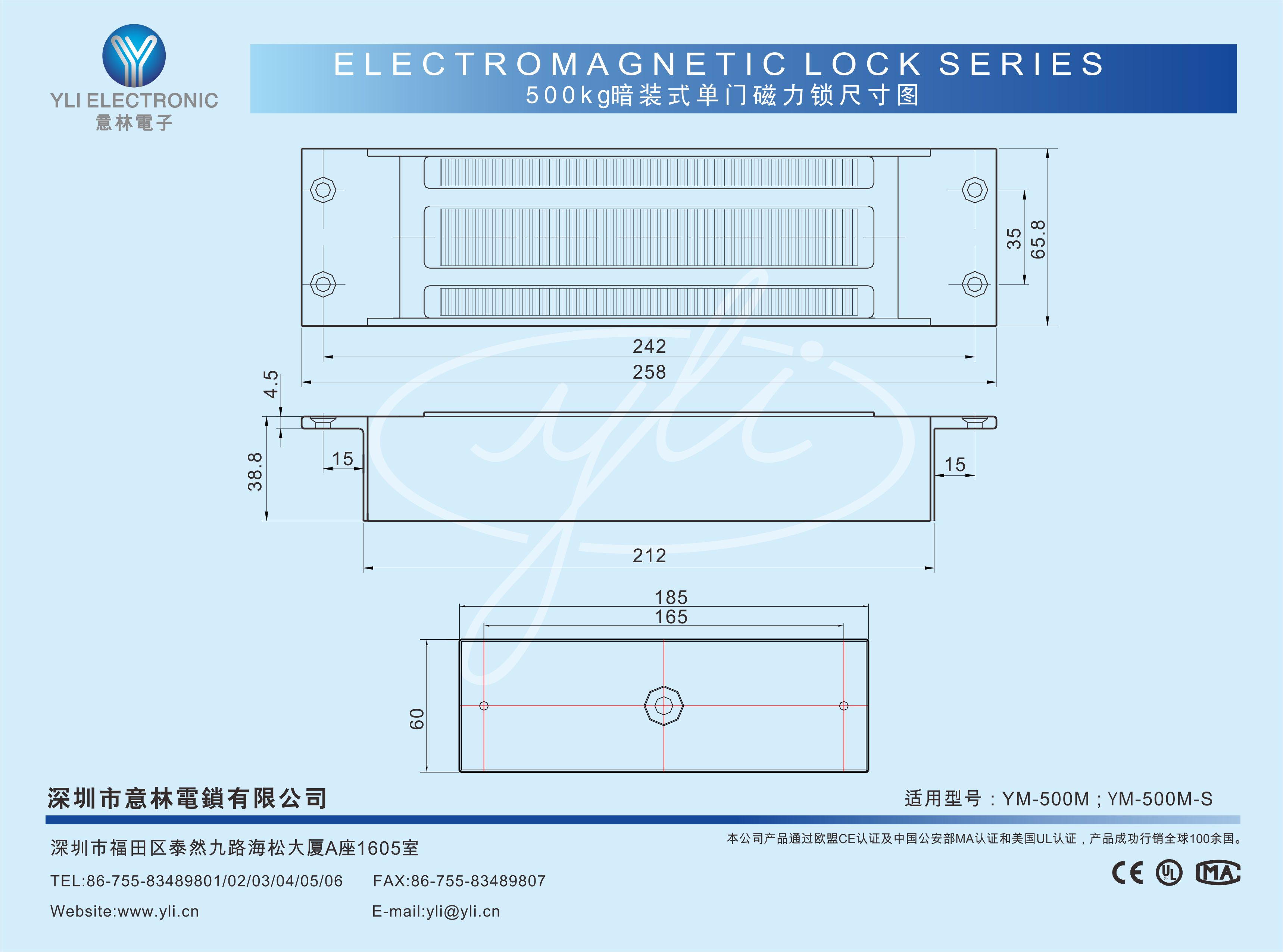 YM-500M/YM-500M-S暗裝式單門磁力鎖是針對木門、金屬門、玻璃門、防火門等設(shè)計的。設(shè)有一組鎖狀態(tài)信號(NO/NC/COM)輸出接點,為門禁系統(tǒng)實時反饋信息。意林磁力鎖加大電磁吸力設(shè)計,吸力超強,鎖芯特殊加強焊接工藝,抗撞擊力及抗扭力比常規(guī)生產(chǎn)工藝強2-3倍,更堅固耐用。表面處理采用國際領(lǐng)先的電鍍工藝,通過國家實驗室240小時鹽霧測試,達(dá)到防氧化、防銹、防腐性能。適用于日常辦公場所或沿海鹽霧,潮濕(如:地鐵,機場,核電站,跨海大橋,港口碼頭,醫(yī)療機構(gòu),沿海城市建筑)等場景使用。本公司產(chǎn)品規(guī)格及配套齊全,內(nèi)開式門或無框玻璃門、窄框門等均有安裝支架配套,有效滿足現(xiàn)代智能建筑的各種場景需求。